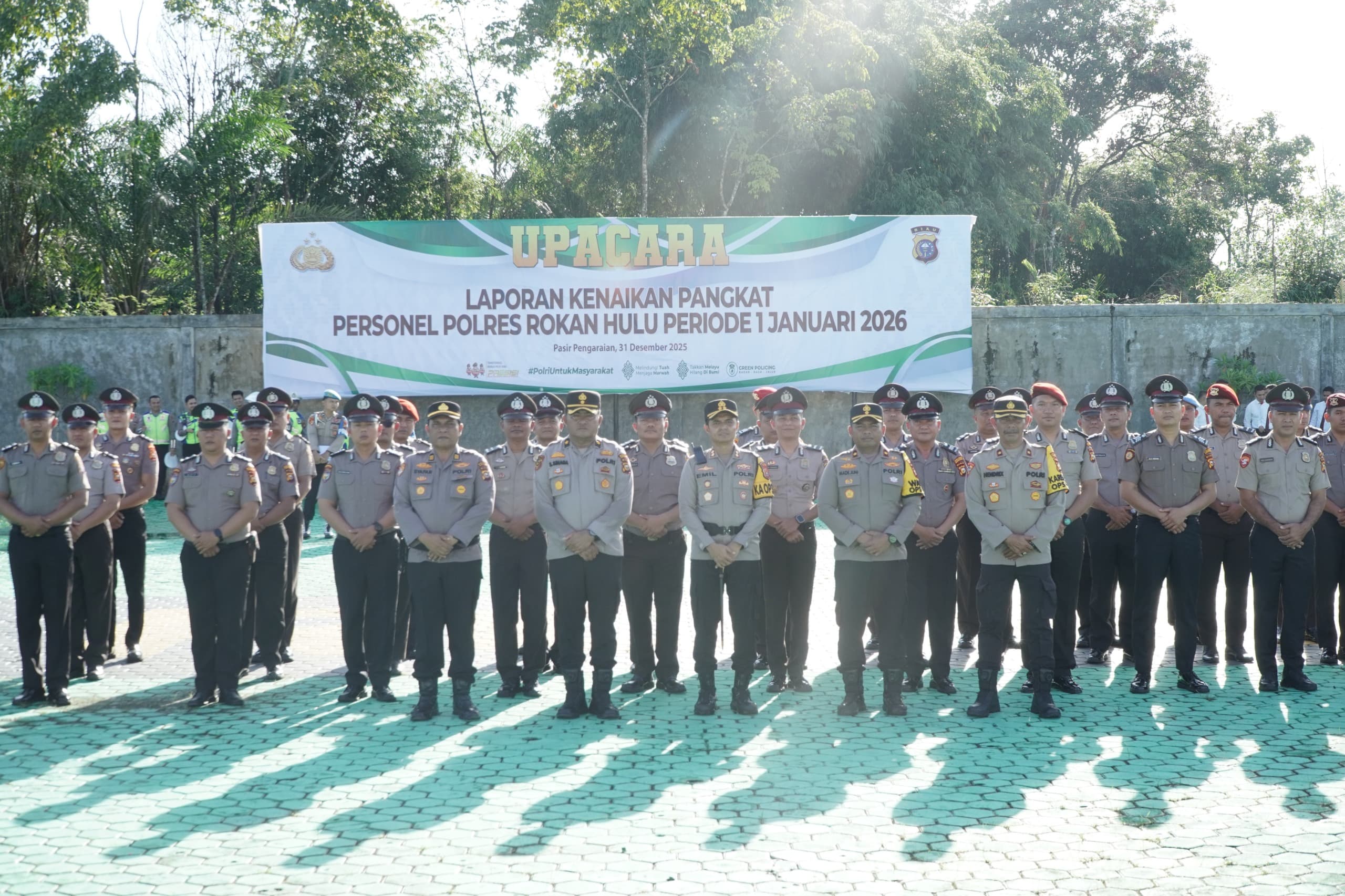 Rokan Hulu – Sebanyak 63 personel Polres Rokan Hulu resmi menerima kenaikan pangkat setingkat lebih tinggi dalam Upacara Laporan Kenaikan Pangkat Periode 1 Januari 2026 yang digelar di halaman Mapolres Rokan Hulu, Rabu (31/12/2025) pagi.